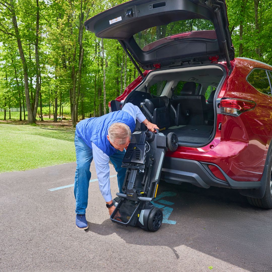 The Buzzaround CarryOn HD is Golden’s most portable heavy-duty scooter, engineered to fold flat to under 14″ high for easy storage in car trunks, SUVs, closets, or tight spaces. The heaviest piece weighs just 52.5 lbs, making transport manageable without sacrificing strength or stability.