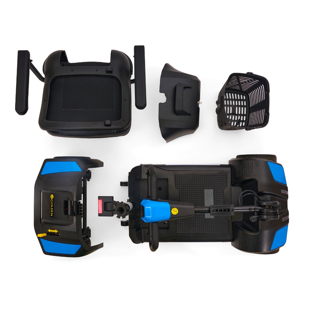 The Buzzaround XL disassembles quickly into manageable pieces for transport and storage. With front and rear LED lighting, USB-A & USB-C charging ports, a phone holder, and a front basket with carry handle and drink holder, this scooter is built for convenience wherever life takes you.
