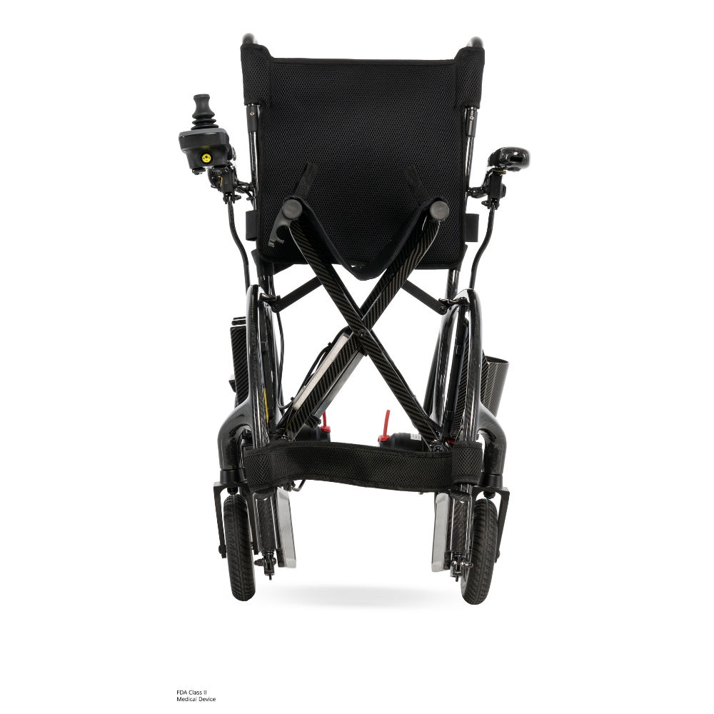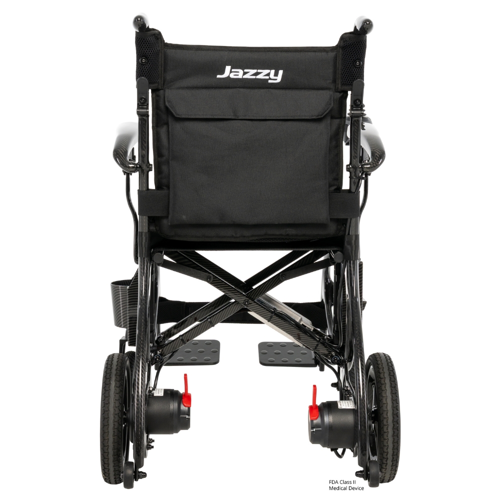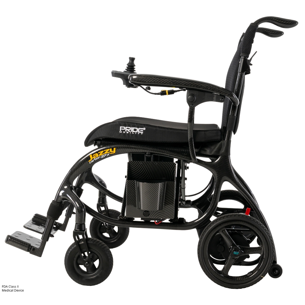 The Pride Jazzy Carbon 27X Folding Power Wheelchair is a premium travel-oriented power wheelchair engineered to combine portability with reliable performance. Its ultra-light carbon-fiber frame makes transporting and storing this chair effortless, whether you’re heading out for a quick errand or long trip. With speeds up to 3.7 mph and a range capable of up to 8–10 miles per charge, you’ll have the freedom to move with confidence both indoors and outdoors. Thoughtful features like a programmable quick-disconnect joystick, airline-compliant battery option, and adjustable height footrests enhance convenience and adaptability for everyday use.